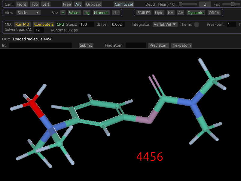The default camera controls for Molchanica are different from other molecule viewing software. The camera is set up with 6 degrees of freedom, using either keyboard + mouse, or mouse only. This makes it easy to get any view of the system you want.
