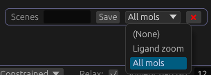 You can also save and restore scenes. These are camera positions and orientations, and view data (e.g. which items are hidden and shown) using the Scenes UI section. To use, first position the camera as you wish. Then type the name of the scene, and click Save. You can load a scene using the dropdown; this shows a list of scenes saved. To delete a saved scene, select it from the dropdown, then click the X button.