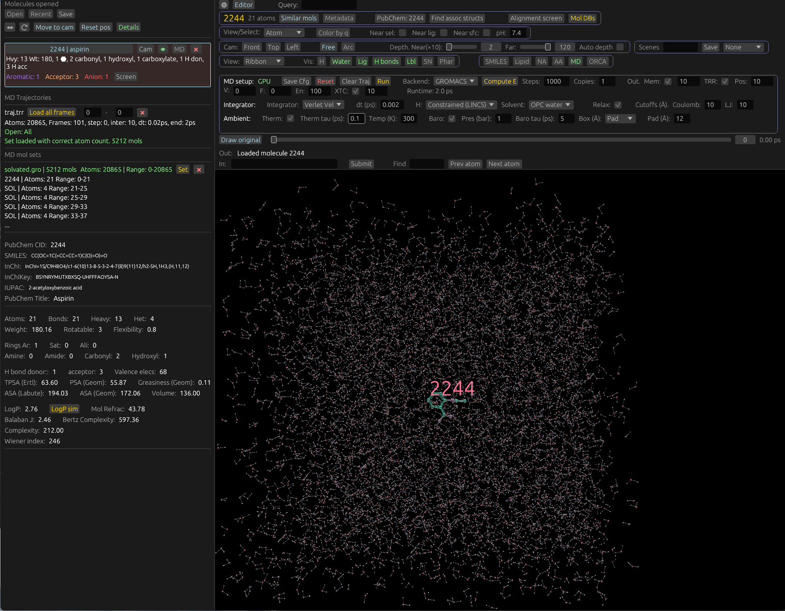 Molchanica can play back MD trajectories generated by itself, and other programs. If running MD locally and memory is selected as an output option (Or if GROMACS is the backend and TRR is selected), frames will be automatically loaded into the viewer upon completion. When loading a trajectory, two components are required: The trajectory itself, and a molecule set.