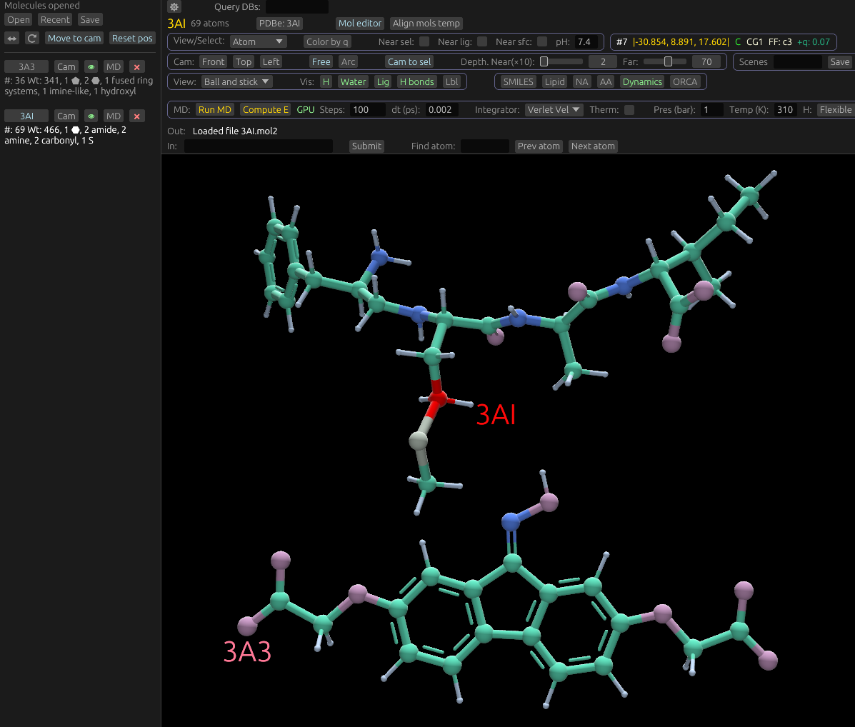 When Molchanica opens a small organic molecule, it characterizes its broad features, and displays them under its entry in the sidebar. See below for an example displaying two molecules, and the features it's characterized: