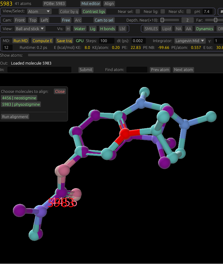 Alignment in Molchanica is flexible: Both the template and query molecules are flexible: They can rotate around bonds, and their bond lengths flex as required. To start, open the two you wish to align. Then click the Align button in the GUI. This will bring up a window where you can configure the alignment. From here select the two molecules to align, and click Run alignment to start.