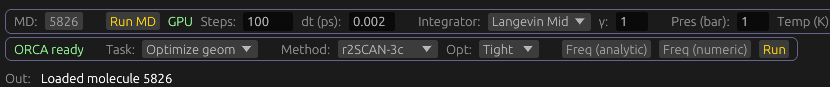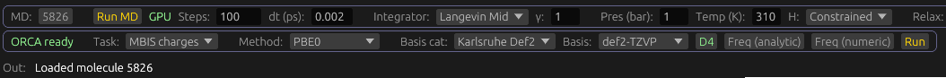 molchanica integrates with the ORCA quantum chemistry software. It provides powerful tools which can supplement this application's functionality. We only support a targeted subset of Orca's functionality, and provide a simple UI for this. This documentation page provides a practical description; for details on how these computations are performed, and hints on how to configure the Orca run, reference the official ORCA manual.