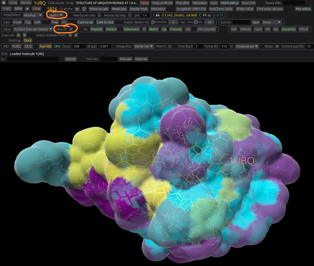 You can also color small molecules each a different color using the Contrast ligs button. This also uses a Viridis color scheme.