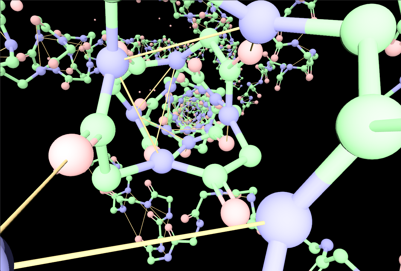 Switch to surface, stick, or density views; orbit around selections; measure bonds and dihedrals.